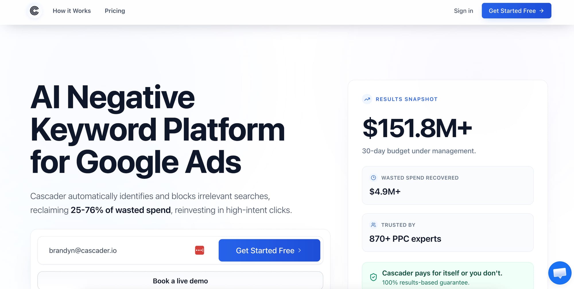 Taking a fundamentally different approach to negative keyword management, Cascader connects to your Google Ads account, analyzes your search terms, and highlights wasted spend directly from your search terms report with clear explanations as to why each query is burning money.